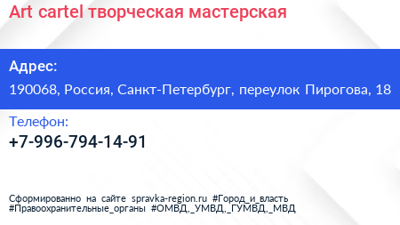 Art cartel, творческая мастерская по адресу 190068, Россия, Санкт-Петербург, переулок Пирогова, 18 в дальнейшем Организация, размещена в следующих категориях:
