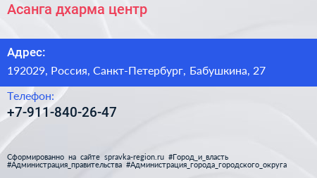 Асанга, дхарма-центр по адресу 192029, Россия, Санкт-Петербург, Бабушкина, 27 в дальнейшем Организация, размещена в следующих категориях: