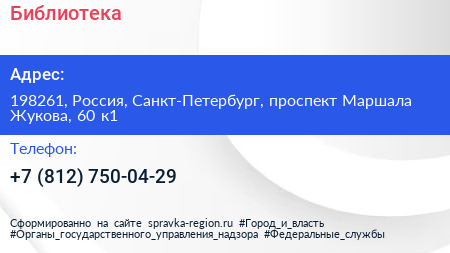 Библиотека по адресу 198261, Россия, Санкт-Петербург, проспект Маршала Жукова, 60 к1 в дальнейшем Организация, размещена в следующих категориях:
