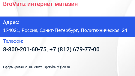 BroVanz, интернет-магазин по адресу 194021, Россия, Санкт-Петербург, Политехническая, 24 в дальнейшем Организация, размещена в следующих категориях: