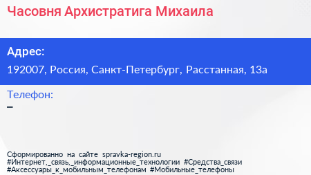 Часовня Архистратига Михаила по адресу 192007, Россия, Санкт-Петербург, Расстанная, 13а в дальнейшем Организация, размещена в следующих категориях: