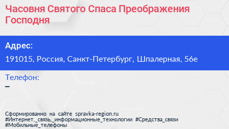 Часовня Святого Спаса Преображения Господня по адресу 191015, Россия, Санкт-Петербург, Шпалерная, 56е в дальнейшем Организация, размещена в следующих категориях: