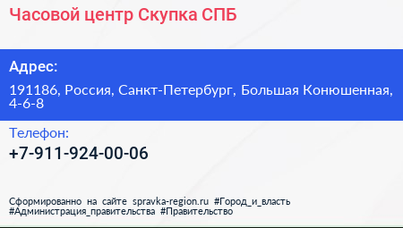 Часовой центр Скупка-СПБ по адресу 191186, Россия, Санкт-Петербург, Большая Конюшенная, 4-6-8 в дальнейшем Организация, размещена в следующих категориях: