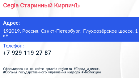 Cegla Старинный КирпичЪ по адресу 192019, Россия, Санкт-Петербург, Глухоозёрское шоссе, 1 к6 в дальнейшем Организация, размещена в следующих категориях: