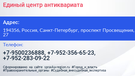 Единый центр антиквариата по адресу 194356, Россия, Санкт-Петербург, проспект Просвещения, 27 в дальнейшем Организация, размещена в следующих категориях:
