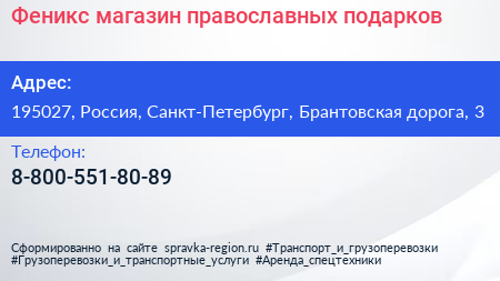 Феникс, магазин православных подарков по адресу 195027, Россия, Санкт-Петербург, Брантовская дорога, 3 в дальнейшем Организация, размещена в следующих категориях: