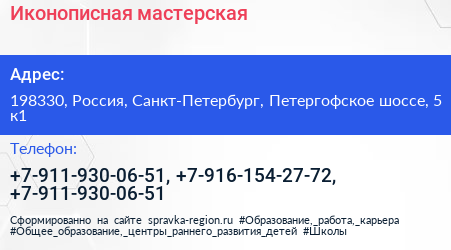 Иконописная мастерская по адресу 198330, Россия, Санкт-Петербург, Петергофское шоссе, 5 к1 в дальнейшем Организация, размещена в следующих категориях: