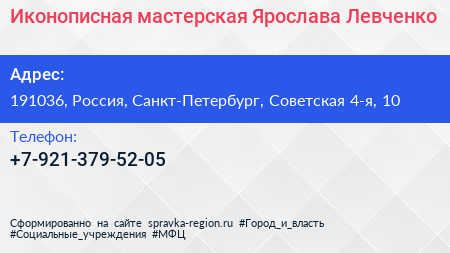 Иконописная мастерская Ярослава Левченко по адресу 191036, Россия, Санкт-Петербург, Советская 4-я, 10 в дальнейшем Организация, размещена в следующих категориях:
