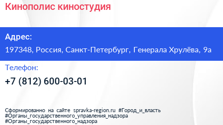 Кинополис, киностудия по адресу 197348, Россия, Санкт-Петербург, Генерала Хрулёва, 9а в дальнейшем Организация, размещена в следующих категориях: