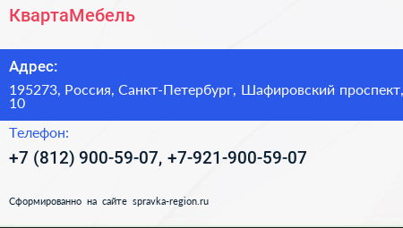 КвартаМебель по адресу 195273, Россия, Санкт-Петербург, Шафировский проспект, 10 в дальнейшем Организация, размещена в следующих категориях: