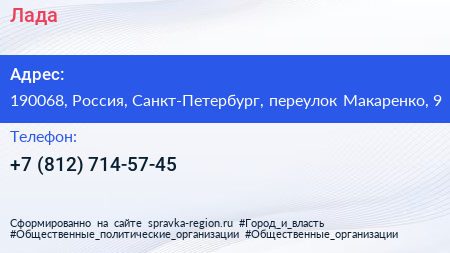 Лада по адресу 190068, Россия, Санкт-Петербург, переулок Макаренко, 9 в дальнейшем Организация, размещена в следующих категориях: