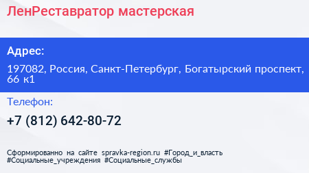 ЛенРеставратор, мастерская по адресу 197082, Россия, Санкт-Петербург, Богатырский проспект, 66 к1 в дальнейшем Организация, размещена в следующих категориях: