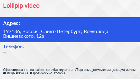 Lollipip video по адресу 197136, Россия, Санкт-Петербург, Всеволода Вишневского, 12а в дальнейшем Организация, размещена в следующих категориях: