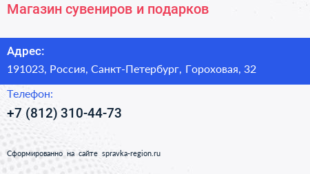 Магазин сувениров и подарков по адресу 191023, Россия, Санкт-Петербург, Гороховая, 32 в дальнейшем Организация, размещена в следующих категориях: