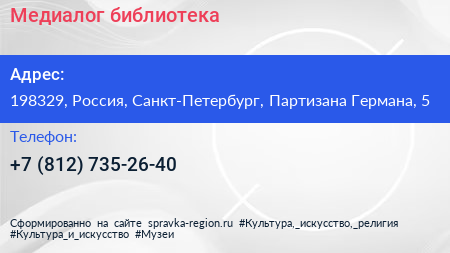 Медиалог, библиотека по адресу 198329, Россия, Санкт-Петербург, Партизана Германа, 5 в дальнейшем Организация, размещена в следующих категориях: