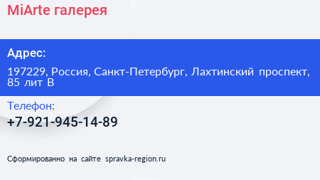 MiArte, галерея по адресу 197229, Россия, Санкт-Петербург, Лахтинский проспект, 85 лит В в дальнейшем Организация, размещена в следующих категориях: