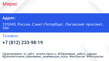 Мирас по адресу 191040, Россия, Санкт-Петербург, Лиговский проспект, 56е в дальнейшем Организация, размещена в следующих категориях: