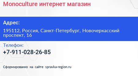 Monoculture, интернет-магазин по адресу 195112, Россия, Санкт-Петербург, Новочеркасский проспект, 16 в дальнейшем Организация, размещена в следующих категориях: