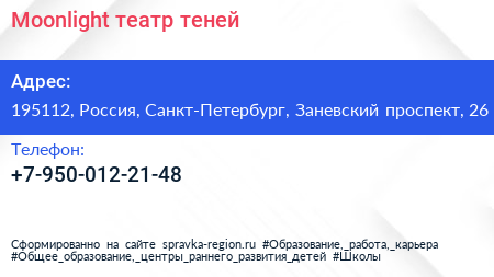 Moonlight, театр теней по адресу 195112, Россия, Санкт-Петербург, Заневский проспект, 26 в дальнейшем Организация, размещена в следующих категориях: