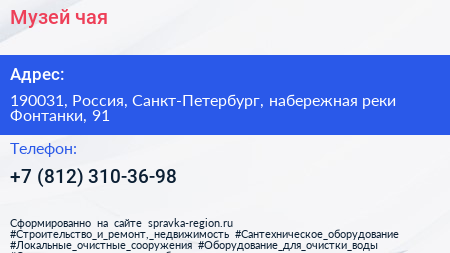 Музей чая по адресу 190031, Россия, Санкт-Петербург, набережная реки Фонтанки, 91 в дальнейшем Организация, размещена в следующих категориях: