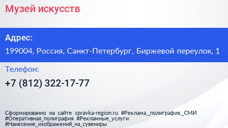 Музей искусств по адресу 199004, Россия, Санкт-Петербург, Биржевой переулок, 1 в дальнейшем Организация, размещена в следующих категориях: