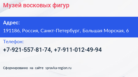 Музей восковых фигур по адресу 191186, Россия, Санкт-Петербург, Большая Морская, 6 в дальнейшем Организация, размещена в следующих категориях: