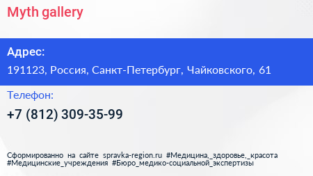 Myth gallery по адресу 191123, Россия, Санкт-Петербург, Чайковского, 61 в дальнейшем Организация, размещена в следующих категориях: