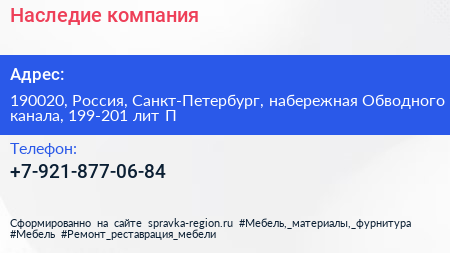Наследие, компания по адресу 190020, Россия, Санкт-Петербург, набережная Обводного канала, 199-201 лит П в дальнейшем Организация, размещена в следующих категориях: