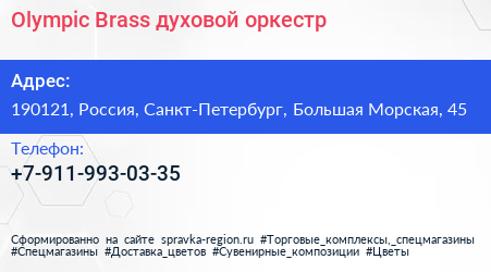 Olympic Brass, духовой оркестр по адресу 190121, Россия, Санкт-Петербург, Большая Морская, 45 в дальнейшем Организация, размещена в следующих категориях: