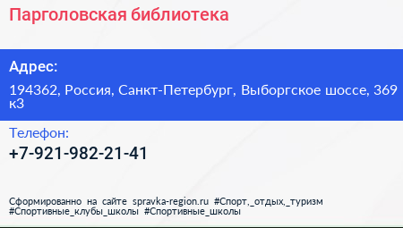 Парголовская библиотека по адресу 194362, Россия, Санкт-Петербург, Выборгское шоссе, 369 к3 в дальнейшем Организация, размещена в следующих категориях: