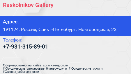 Raskolnikov Gallery по адресу 191124, Россия, Санкт-Петербург, Новгородская, 23 в дальнейшем Организация, размещена в следующих категориях:
