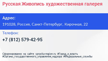 Русская Живопись, художественная галерея по адресу 191028, Россия, Санкт-Петербург, Кирочная, 22 в дальнейшем Организация, размещена в следующих категориях: