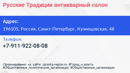 Русские Традиции, антикварный салон по адресу 196105, Россия, Санкт-Петербург, Кузнецовская, 48 в дальнейшем Организация, размещена в следующих категориях: