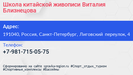Школа китайской живописи Виталия Близнецова по адресу 191040, Россия, Санкт-Петербург, Лиговский переулок, 4 в дальнейшем Организация, размещена в следующих категориях: