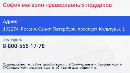 София, магазин православных подарков по адресу 195274, Россия, Санкт-Петербург, проспект Культуры, 1 в дальнейшем Организация, размещена в следующих категориях: