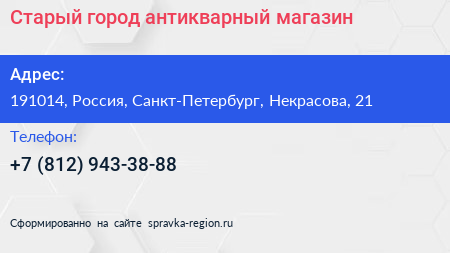 Старый город, антикварный магазин по адресу 191014, Россия, Санкт-Петербург, Некрасова, 21 в дальнейшем Организация, размещена в следующих категориях: