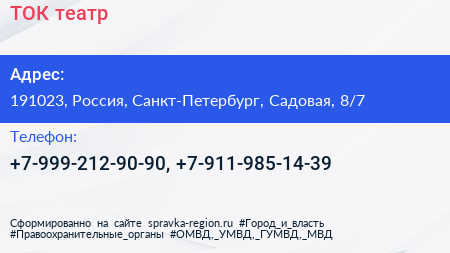 ТОК, театр по адресу 191023, Россия, Санкт-Петербург, Садовая, 8/7 в дальнейшем Организация, размещена в следующих категориях: