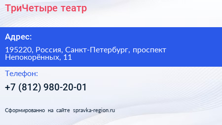 ТриЧетыре, театр по адресу 195220, Россия, Санкт-Петербург, проспект Непокорённых, 11 в дальнейшем Организация, размещена в следующих категориях: