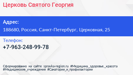 Церковь Святого Георгия по адресу 188680, Россия, Санкт-Петербург, Церковная, 25 в дальнейшем Организация, размещена в следующих категориях: