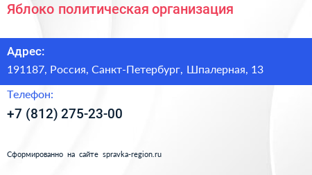 Яблоко, политическая организация по адресу 191187, Россия, Санкт-Петербург, Шпалерная, 13 в дальнейшем Организация, размещена в следующих категориях:
