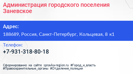 Администрация городского поселения Заневское по адресу 188689, Россия, Санкт-Петербург, Кольцевая, 8 к1 в дальнейшем Организация, размещена в следующих категориях: