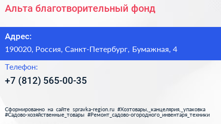 Альта, благотворительный фонд по адресу 190020, Россия, Санкт-Петербург, Бумажная, 4 в дальнейшем Организация, размещена в следующих категориях: