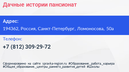 Дачные истории, пансионат по адресу 194362, Россия, Санкт-Петербург, Ломоносова, 50а в дальнейшем Организация, размещена в следующих категориях: