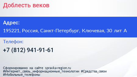 Доблесть веков по адресу 195221, Россия, Санкт-Петербург, Ключевая, 30 лит А в дальнейшем Организация, размещена в следующих категориях: