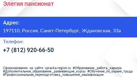 Элегия, пансионат по адресу 197110, Россия, Санкт-Петербург, Ждановская, 33а в дальнейшем Организация, размещена в следующих категориях: