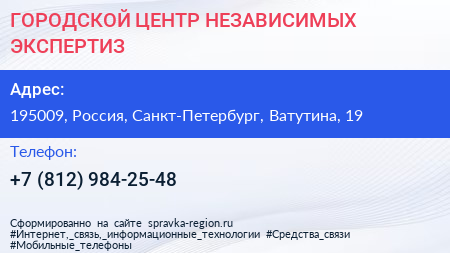 ГОРОДСКОЙ ЦЕНТР НЕЗАВИСИМЫХ ЭКСПЕРТИЗ по адресу 195009, Россия, Санкт-Петербург, Ватутина, 19 в дальнейшем Организация, размещена в следующих категориях: