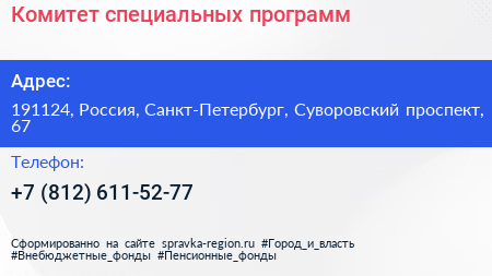 Комитет специальных программ по адресу 191124, Россия, Санкт-Петербург, Суворовский проспект, 67 в дальнейшем Организация, размещена в следующих категориях: