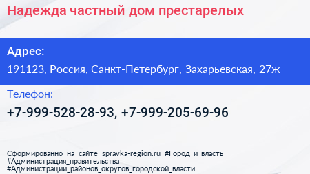 Надежда, частный дом престарелых по адресу 191123, Россия, Санкт-Петербург, Захарьевская, 27ж в дальнейшем Организация, размещена в следующих категориях: