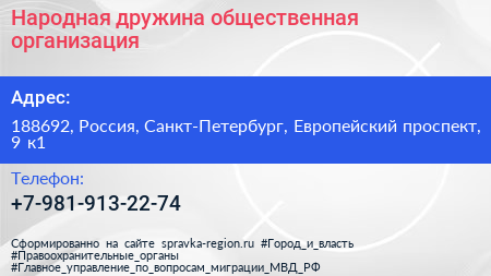 Народная дружина, общественная организация по адресу 188692, Россия, Санкт-Петербург, Европейский проспект, 9 к1 в дальнейшем Организация, размещена в следующих категориях: