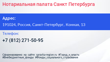 Нотариальная палата Санкт-Петербурга по адресу 191024, Россия, Санкт-Петербург, Конная, 13 в дальнейшем Организация, размещена в следующих категориях: